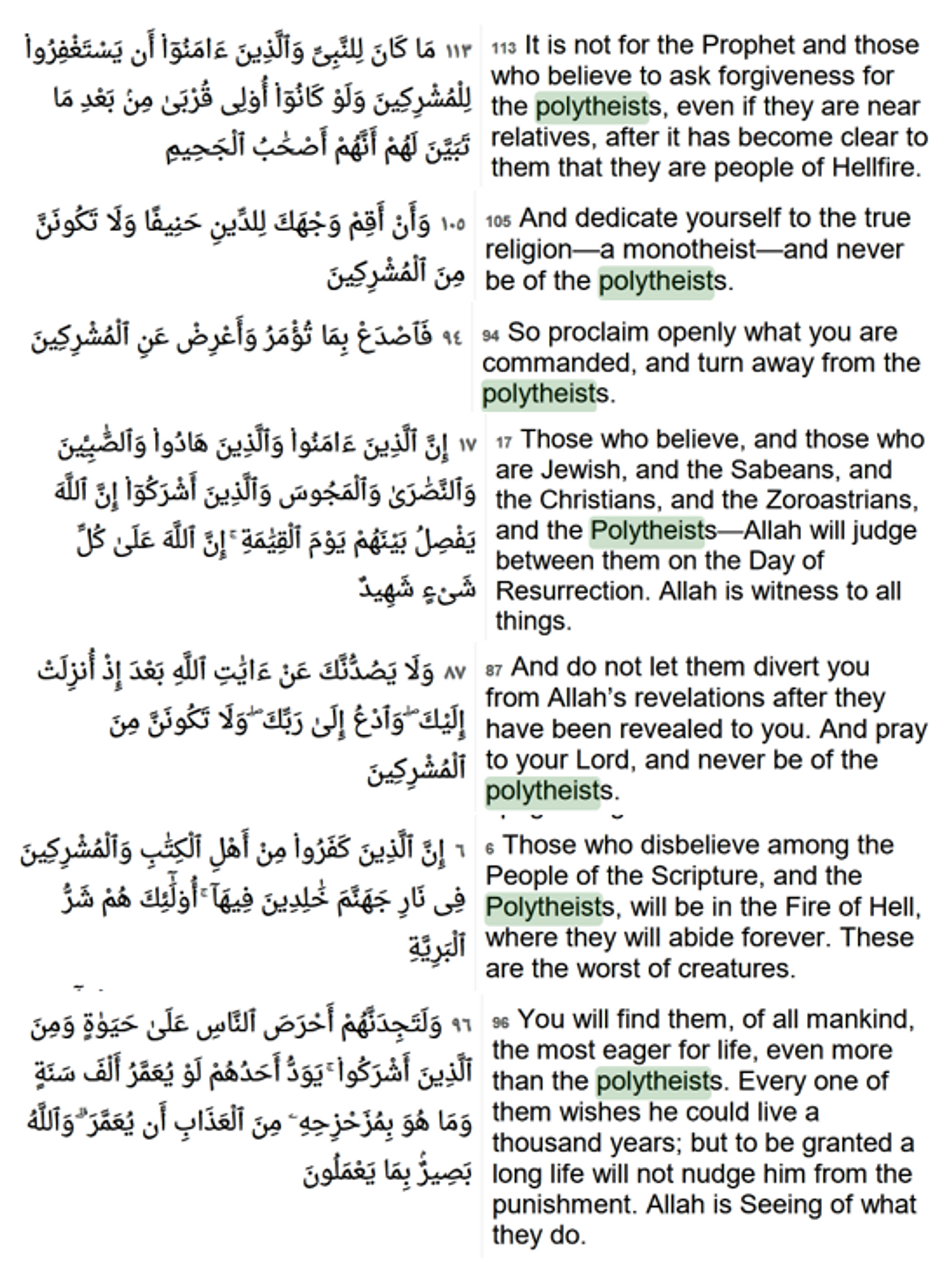 The translation and meaning of the above Quranic verses are highly deceptive. The simple meaning of some may be "Allah will see them...or similar". However, when the wishes of Islamic Allah are read in Hadith and other books, it authorises the Muslims to carry out the wishes of their Allah. One may hear a person threatening other with the same words "I will see you..." and none should have a dilemma as to what it means. It clearly means bodily harm or repression. Hence, all these verses are covertly discriminatory, hateful, intolerant and bigoted towards the believers of other religions and idol worshippers.