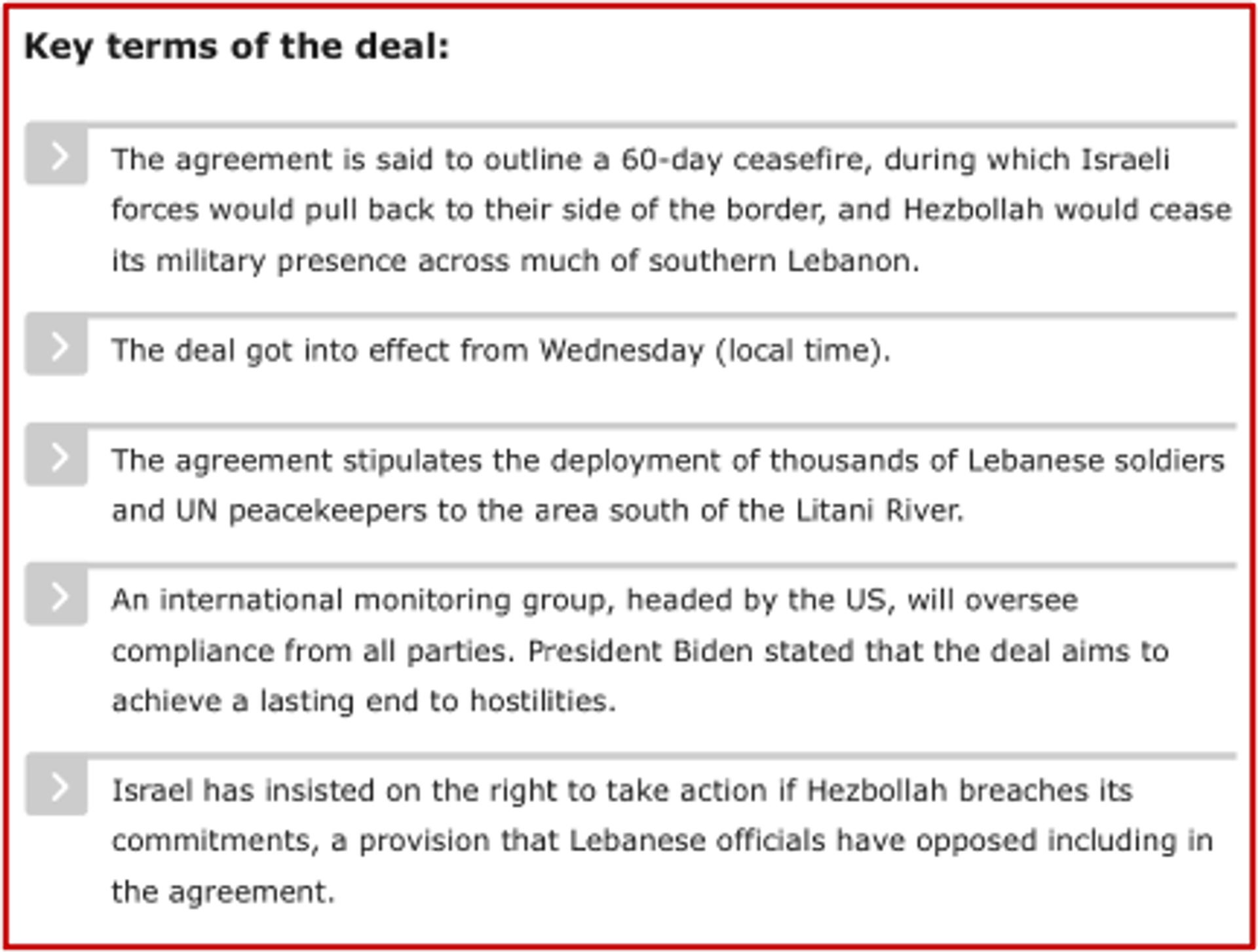 - The first clause of the agreement itself is vague that could be exploited by either of the warring party where it reads “Hezbollah will cease its military presence across much of southern Lebanon”. What is meant by “much of southern Lebanon”? No one can explain.