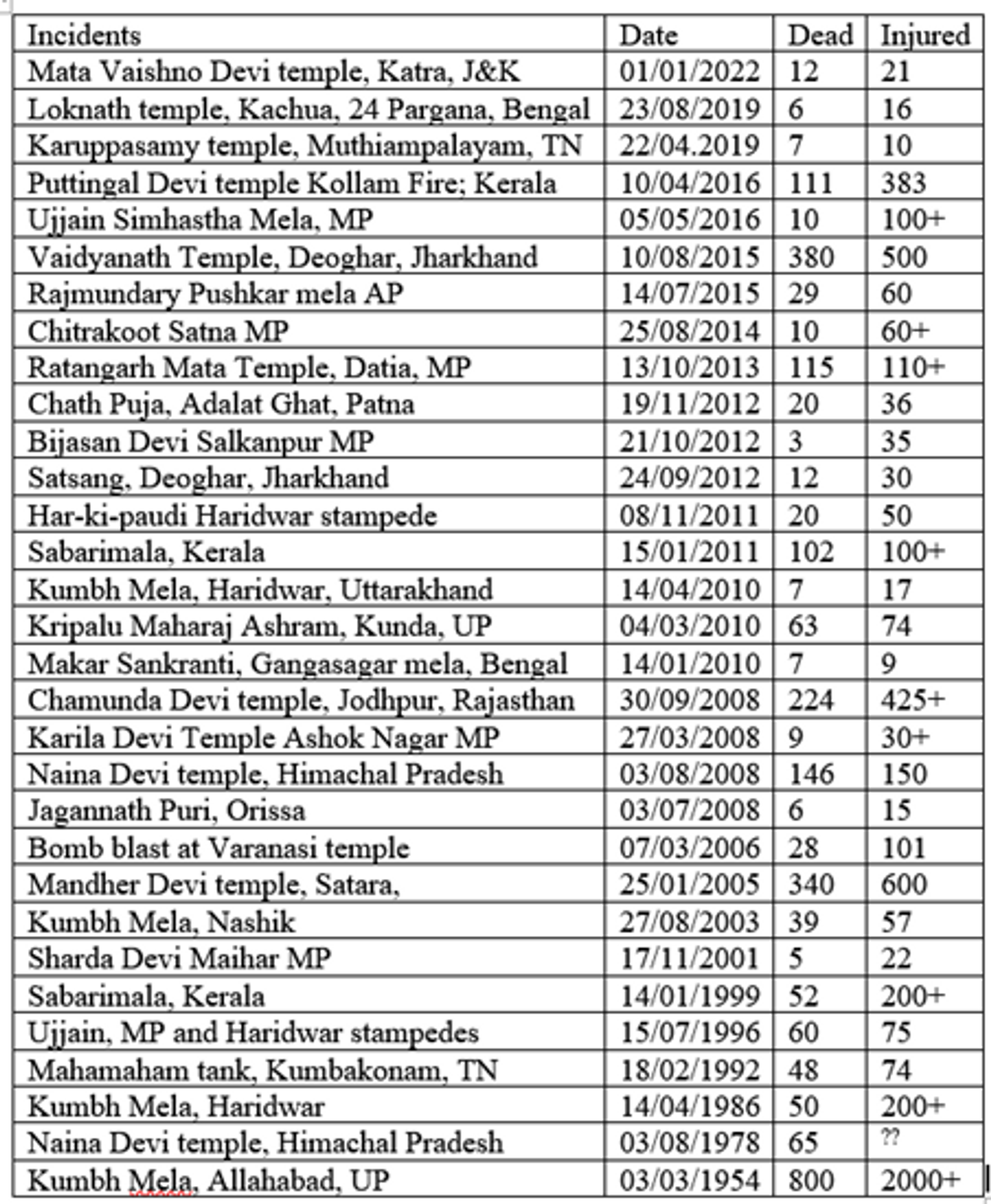 भारत के कुछ प्रसिद्द मंदिरों में अक्सर हादसे होते रहे हैं और हाल के वर्षों में हुए कुछ घटनाओं के विवरण निम्नलिखित हैं:-