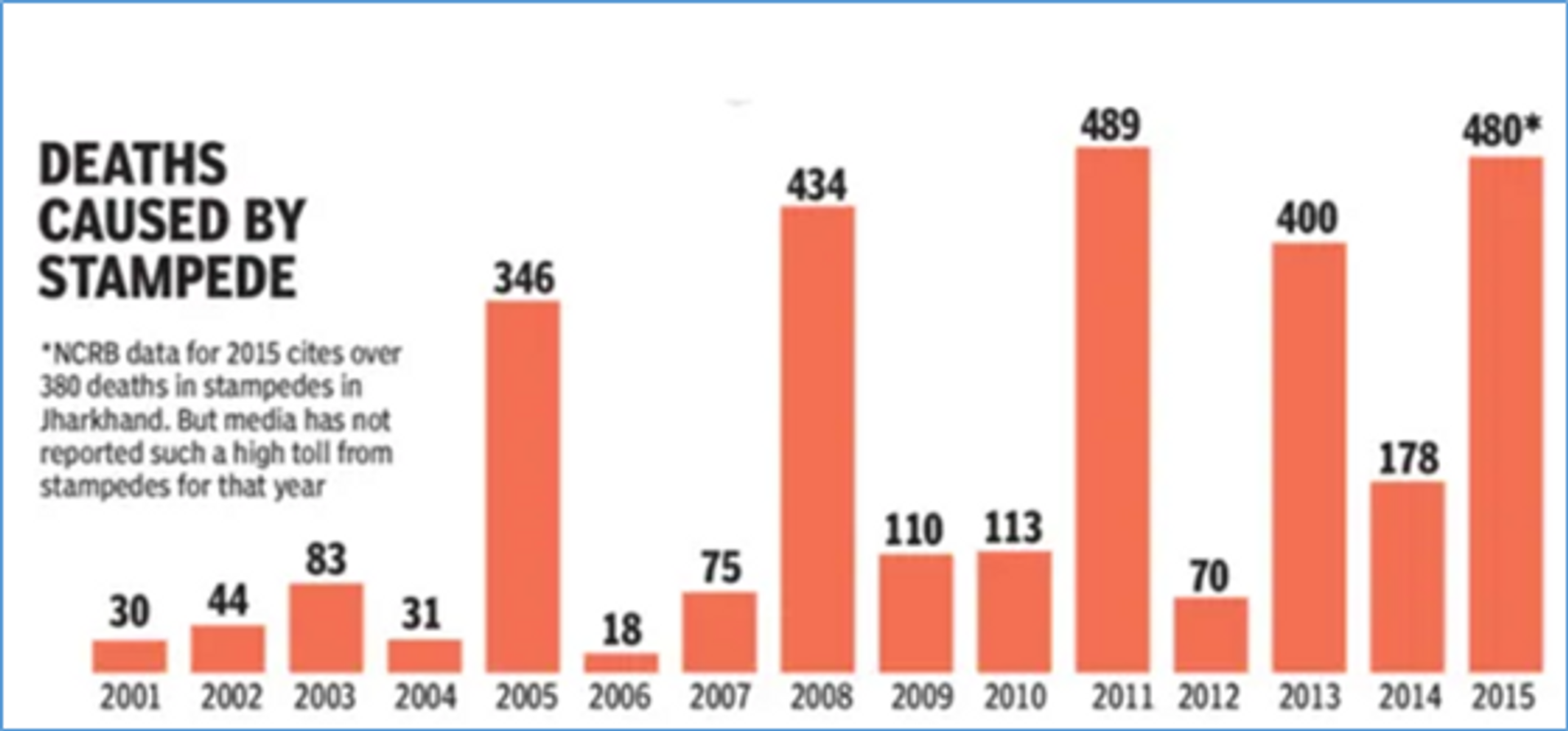 2015-१६ में ऊपर दिखाए गए NCRB के आंकड़े बताते हैं कि भारत के मंदिरों और पर्यटन स्थलों में ज्यादातर मौत भगदड़ में कुचले जानें के कारण हुआ है और ऐसी भगदड़ की घटनाएं कुछ स्थानों में बार बार होतीं हैं।यह बड़े शर्म की बात है कि स्थानीय सरकार सुरक्षा के लिए यथोचित उपाय नहीं करती।
