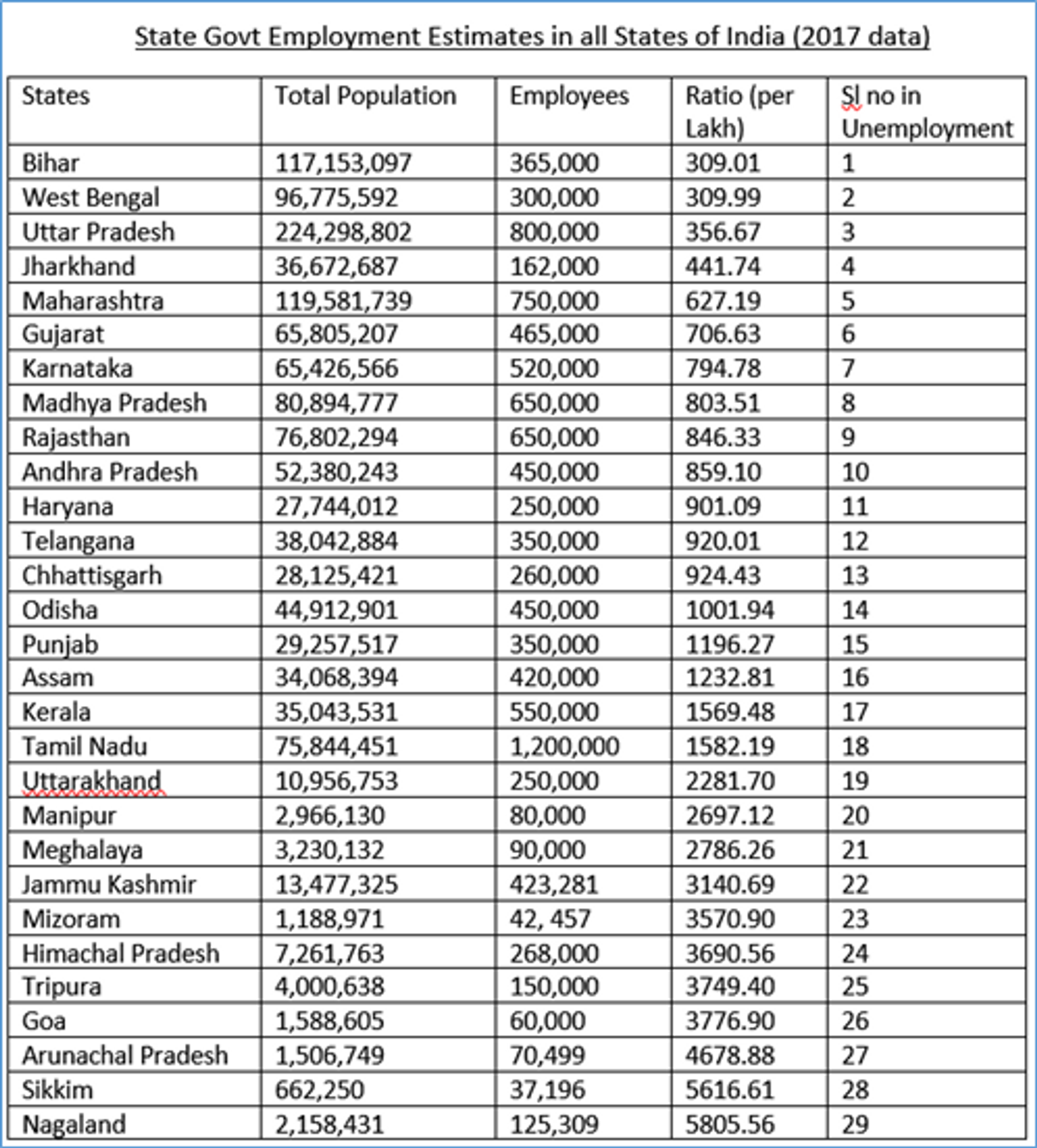 उपर्युक्त डाटा २०१७ के अंत का है।आज के दिन बिहार में लगभग ३.२ लाख सरकारी नौकरी रह गयी है।इसके अलावे बिहार में अन्यान्य मुख्यमंत्रियों की अनमनस्यता के कारण कोई निजी कंपनी निवेश करने से कतराती है कि कौन मरे उस रावण तंत्र और जंगल राज में। यही कारण है कि बिहार में सबसे अधिक बेरोजगारी है और लोग दूसरे राज्यों में मजदूरी के लिए ही सही, पलायन को मजबूर हैं चाहे वहाँ उनकी हत्याएँ ही क्यों न हो रही हो।
