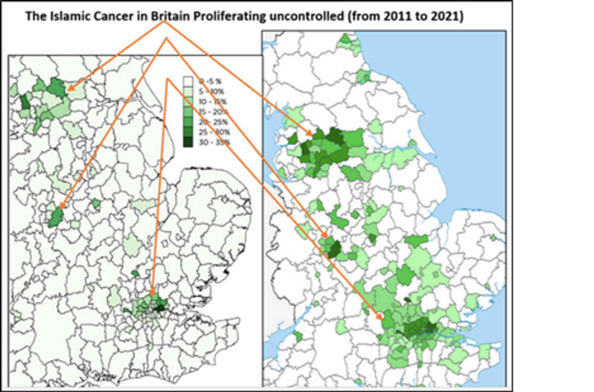 British Administration has been increasingly becoming vulnerable to several social and human erosions in the recent decades, some even detrimental to its peaceful existence. These erosions include increasing political clout of the Islamists and rapidly proliferating Muslim community in many Ghettos where they start dominating the others by sheer numbers and sponsored mob violence. Later they become a significant law and order problem, even preventing access of the police in their ghettos. In Britain, the numbers of Muslims and the sizes of such ghettos has been increasing at rapid pace. Along with the numbers, comes Islamic hate, intolerance, bigotry and Fascism preached by their mosques against the local non-Muslim communities. Most radical and Islamic terror elements having allegiance to numerous radical and terror groups elsewhere, find shelter here. The figure below, shows the increase in the size of Islamic Cancer in Britain in the last 10 yrs alone. It should be a matter of great worry for the British.