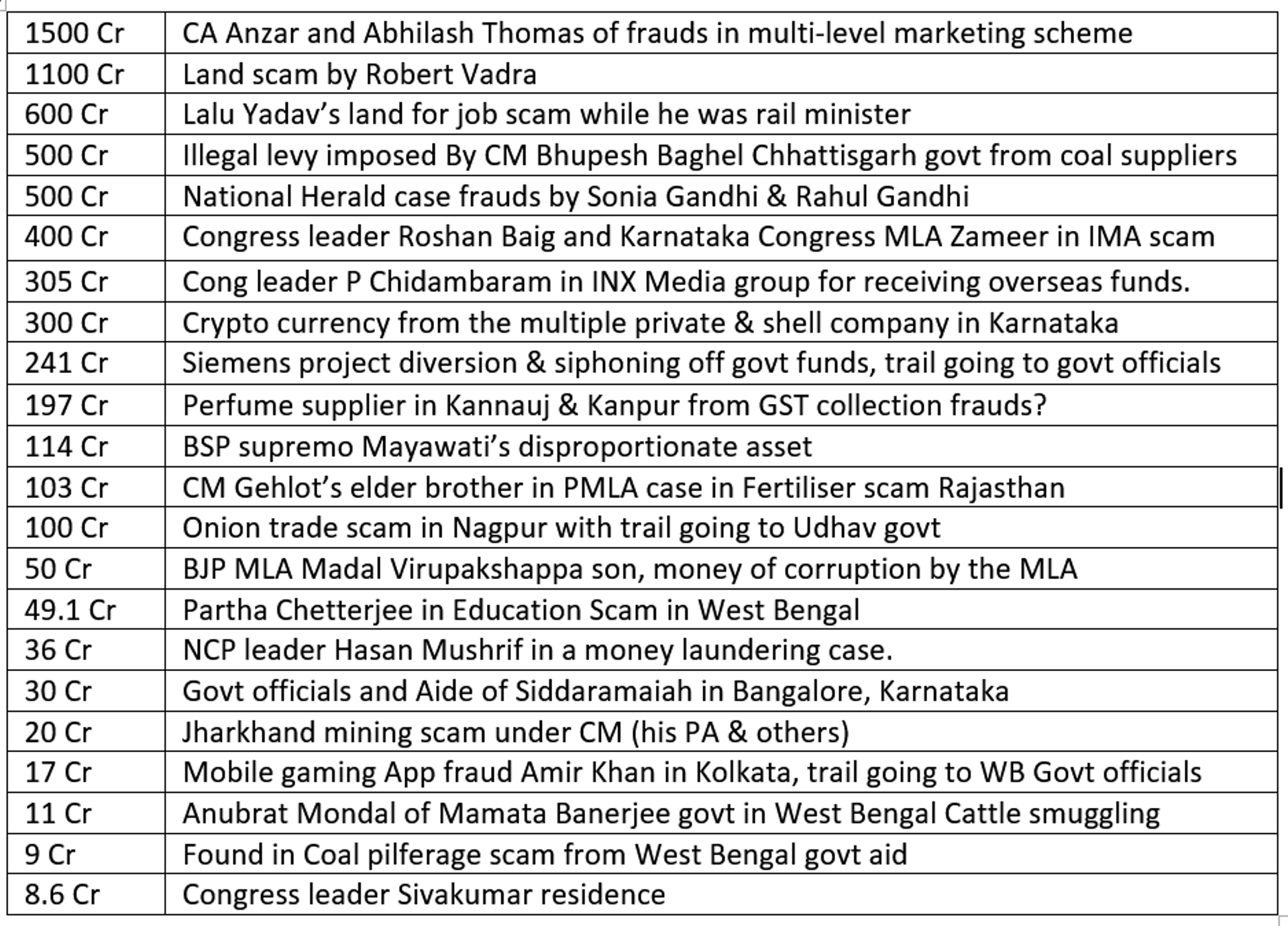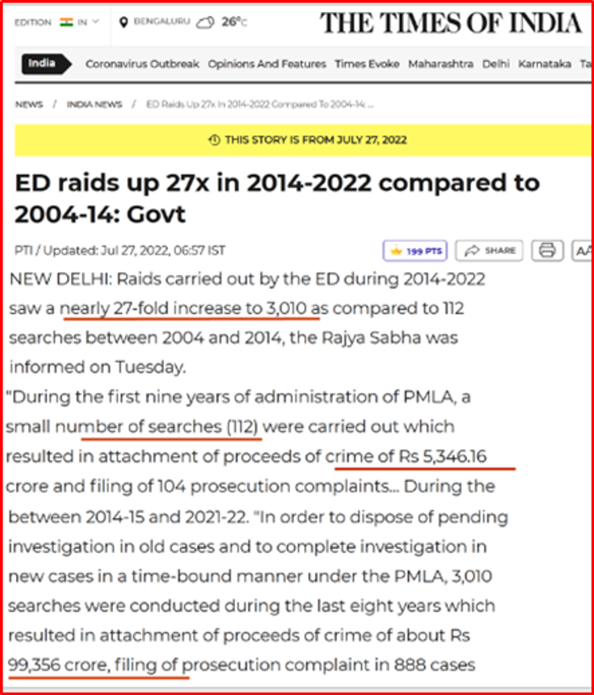 The cash haul made/uncovered by the ED in recent years are unprecedented. In fact, as per Modi govts’ clarification given on 27 Jun 22 in the Rajya Sabha, in the 10 yrs of the UPA govt from 2004-14, 112 ED raids were carried out to uncover Rs 5346 Cr. Under Modi govt, a total of 3010 raids have been conducted (nearly 27 times more) from 2014-22 uncovering approx Rs 99,356 Cr. This is unprecedented. In many ways. Corruption amongst politicians is extremely high with Congress, TMC, RJD and NCP at the top.