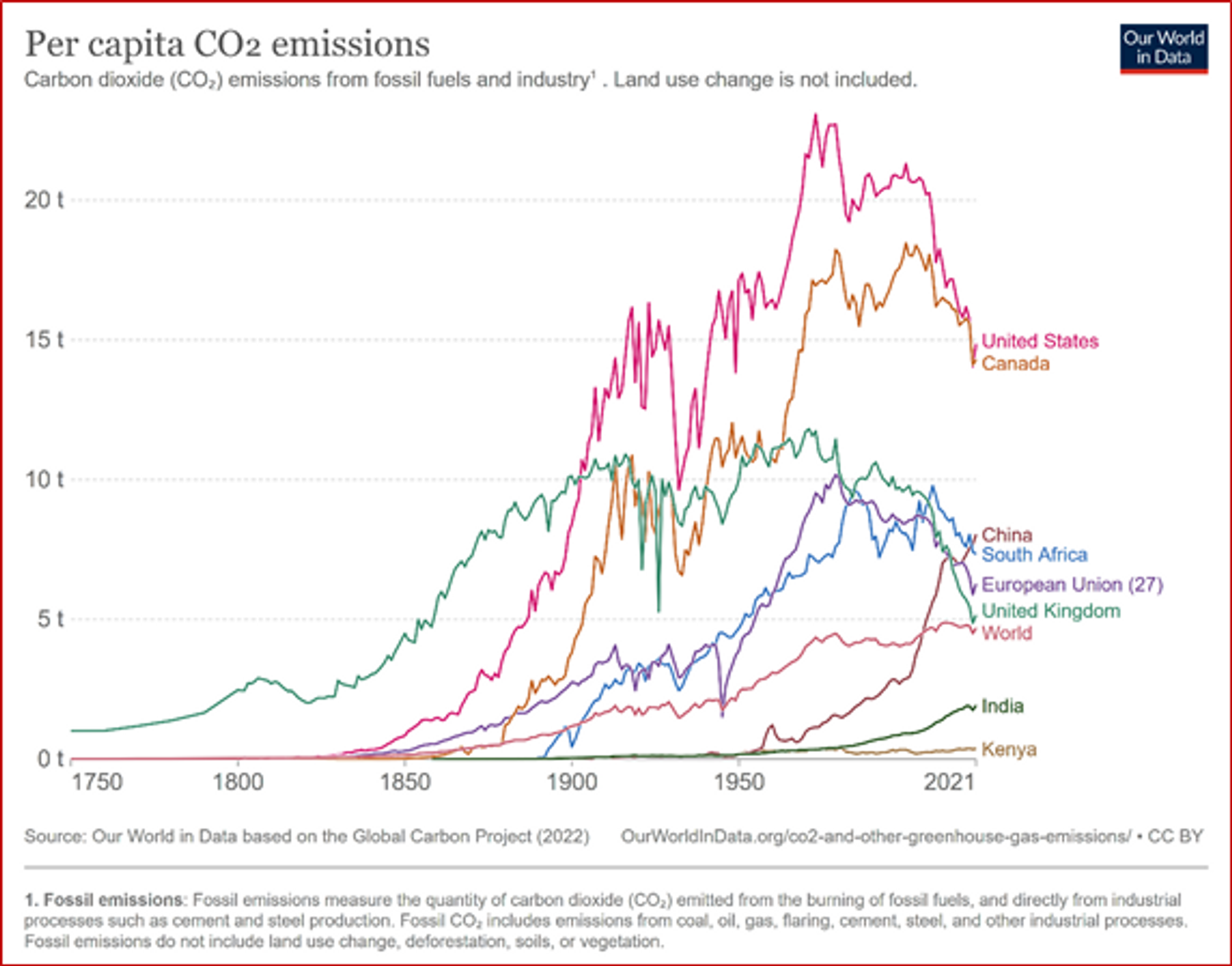 The Twenty-seventh Convention on Climate Change (COP27) of the UN Human Rights Panel has taken a conscious decision on 20 Nov 2022 to create a “Loss & Damage Fund” to compensate the victims of Climate Change. This fund will essentially compensate the vulnerable nations in developing countries whose lives and livelihoods are being ruined by the worst impacts of climate change. The modalities of generating and disbursing this fund will be worked out through a ‘Transitional Committee’ to make recommendations for the funding arrangements at the COP28. It is remarkable that some of the nations having very meagre carbon-footprints suffer drastically with the consequences of the climate change caused by the few indulging nations. It is known that there will be a cost of development on the planet for a better life and livelihood of every individual collectively. Today, the per-head or per capita carbon footprint of fossil fuel emission is highly unequal in different nations as shown in the graphs below (data source: https://ourworldindata.org/co2-emissions) with USA, Canada, China and South Africa figuring much higher than the world average.