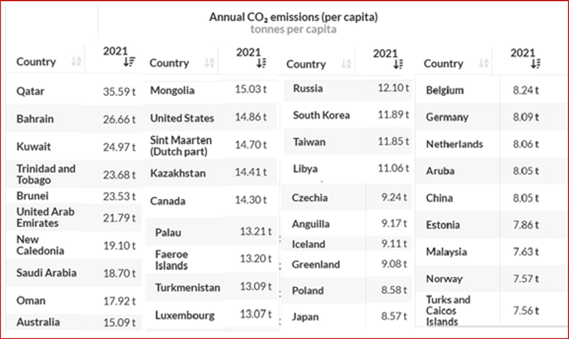 Among the major economies or well-to-do nations, the 40 worst per capita polluters include Saudi Arabia, Australia, USA, Canada, Russia, South Korea, Poland, Japan, Belgium, Germany, China and Malaysia with tons of CO2 emissions as shown below. Hence, if the pollution tax has to be levied to the polluters, they are the ones who must be made to pay for building the kitty for the “Loss and Damage Fund”.