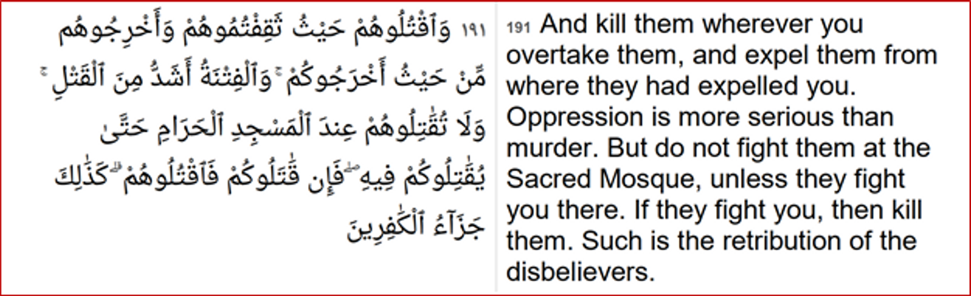 Chapter 2 (Heifer), Verse 191 incites to kill the believers of other faiths/religions thus violating the right to life.