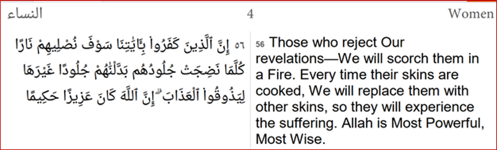 Chapter 4 (The Woman) Verse 56 is also hateful, intolerant, bigoted and threatens life with the worst forms of violence.