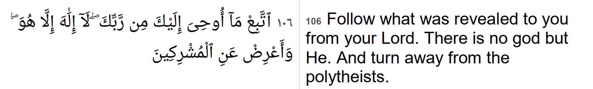 Chapter 6 ‘Livestock’ verse 106 lays down the Islamic concept that there is no other god (what polytheists believe) except Allah. This is discriminatory as Quran cannot discredit or deny the presence of various Gods that believers of other religions/faiths worship. This verse deserves to be amended.