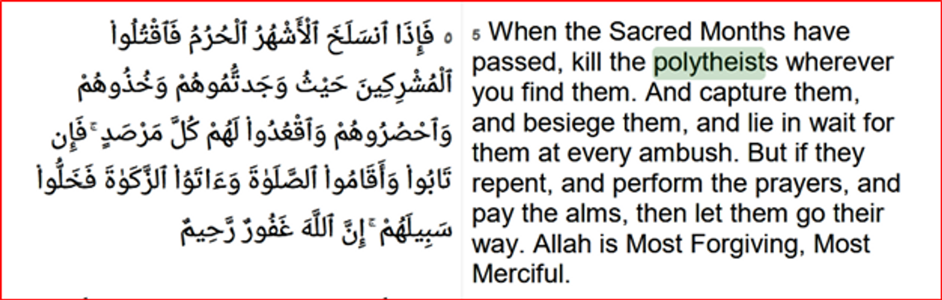 Chapter 9 ‘Repentance’ verses 2, 3, 5, 17, 28, 68 & 73 make many discriminatory, hateful and offensively bigoted statements against believers of religions/faiths other than Islam, polytheists and worshippers of Gods through idols. In verse 2 Quran threatens that Allah will disgrace the believers of other religions which is a hateful offensively bigoted statement. Worse, verse 5 threatens the polytheists to kill them because of their religion. : -