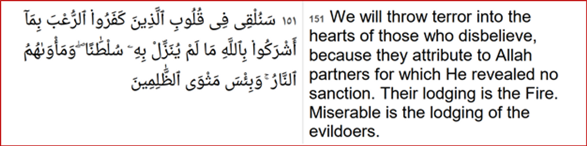 Chapter 3 (Family of Imran), Verse 151 is discriminatory, hateful, bigoted and also threatens the right to life.
