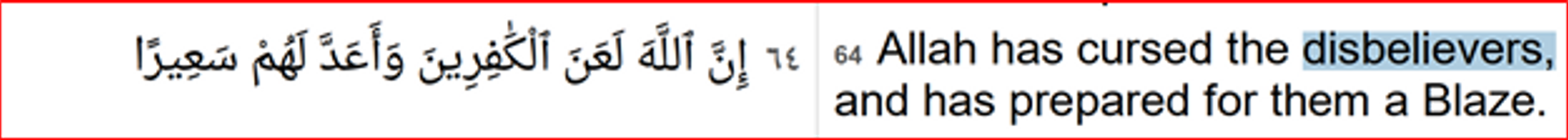 It is acknowledged that many of the verses quoted below are in isolation but inferred in continuity with preceding or succeeding verses many of which have perceptional ambiguity. If a cleric wants to play down the offensive contents of these verses, he would try to mellow it down with other verses quoted elsewhere. It is also emphasised that most of the Quranic verses are for instilling the faith of Muslims in their Allah and doing good for fellow Muslims (referred as 'believers'). However, lot many verses are highly critical of the non-Muslims who follow faith in Gods other than Allah. They are termed disbelievers. Disbelievers in Quran are looked down in varying grades of simple discrimination, to hateful & intolerant expressions often of bigotry when it awards punishments like death, burning in fire and so on...only because they believe in God other than Islamic Allah that any person in secular, non-Islamic states have the freedom to do. Yet, there is a separate chapter 109 of a single verse on ‘Disbeliever’ that is silent of all prior expressions mentioned in the preceding chapters. ”
