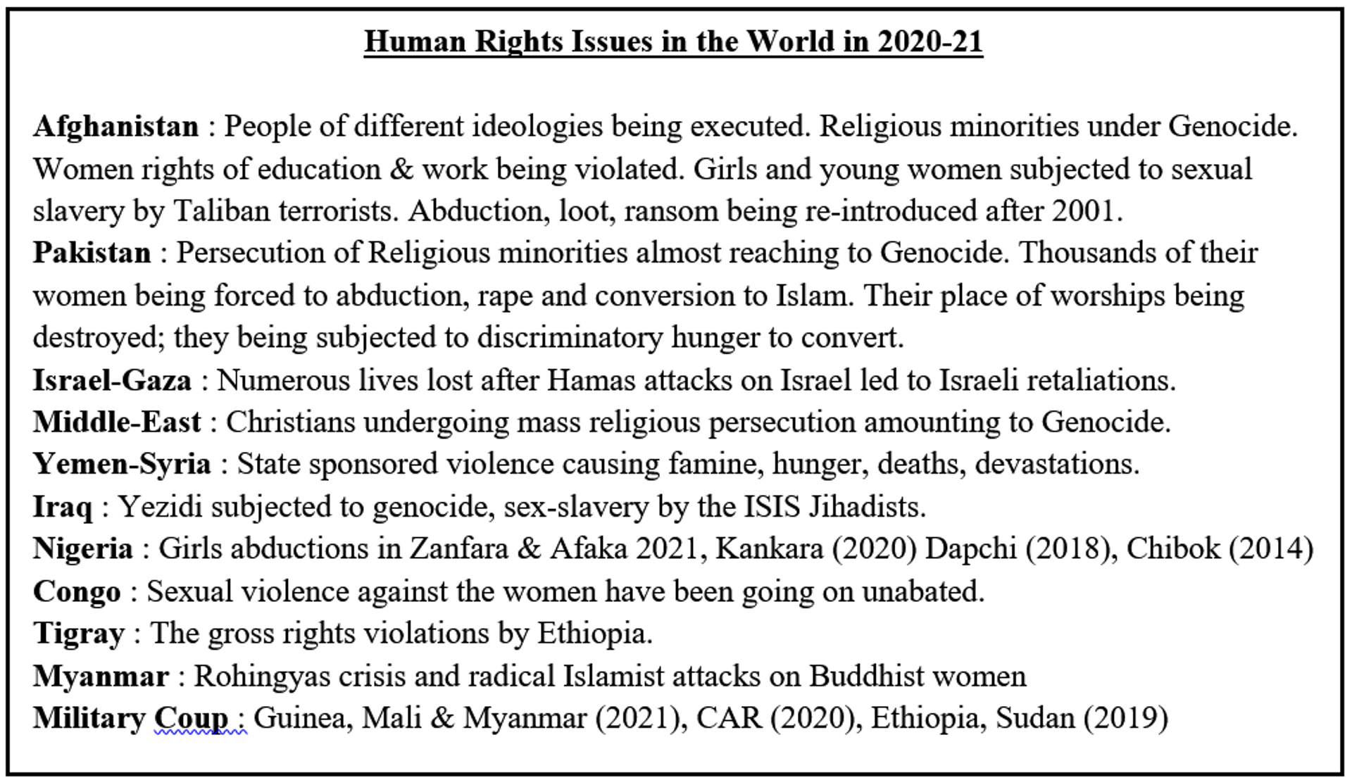 Today the UN Human Rights Council (HRC) is putting itself under increasing irrelevance by becoming insensitive or partisan in raising and investigating the Human Rights Issues in different parts of the world, more so in Asia and Africa. The Human Rights bodies have always been somewhat vindictive and partisan in their approach. Ever since the Cairo declaration, the Islamic nations have taken it for granted that they can abuse Human Rights and get away in the name of Islam. The religious minorities in the Islamic countries have vanished in thin air and no investigation by independent groups have been carried out. There are Human Rights issues in the war zones of Yemen, Syria and elsewhere, treated with high levels of insensitivities and biases. Military coups and related rights violations in different nations are treated differently. Islamic Jihadists and radicals are committing global terrors, killing innocent lives but the rights groups become deaf & dumb to such violations. Thus, Human rights bodies have disgraced itself by virtue of their biases and partisanship. Many of the burning issues in the world often don’t even find mention in the 2021 UNHRC report. The burning issues of Human Rights in the last one year are briefly enumerated in the text box below but the annual report is at wide variance.