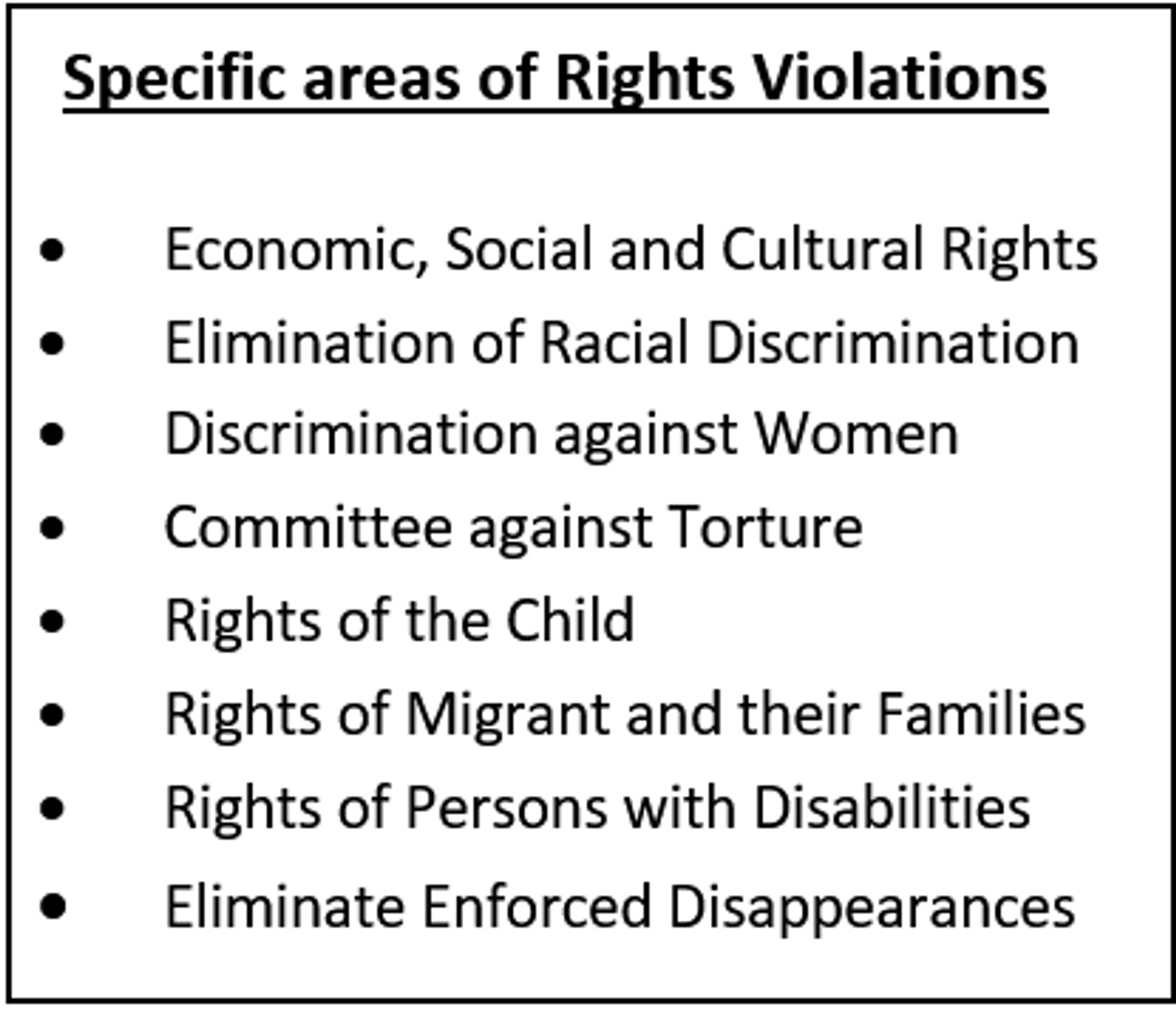 UNHRC has specific areas of its concerns and investigations that include the broad groups as enumerated in the text box. It has 3 fixed review meetings in a year. In every review meeting 16 nations are reviewed for their performance on Rights issues. Thus a four year-cycle to complete review of all 193 Member States of the UN are done. Besides, special review of any unusual occurrences could be called for at any time of gross Rights Violations.