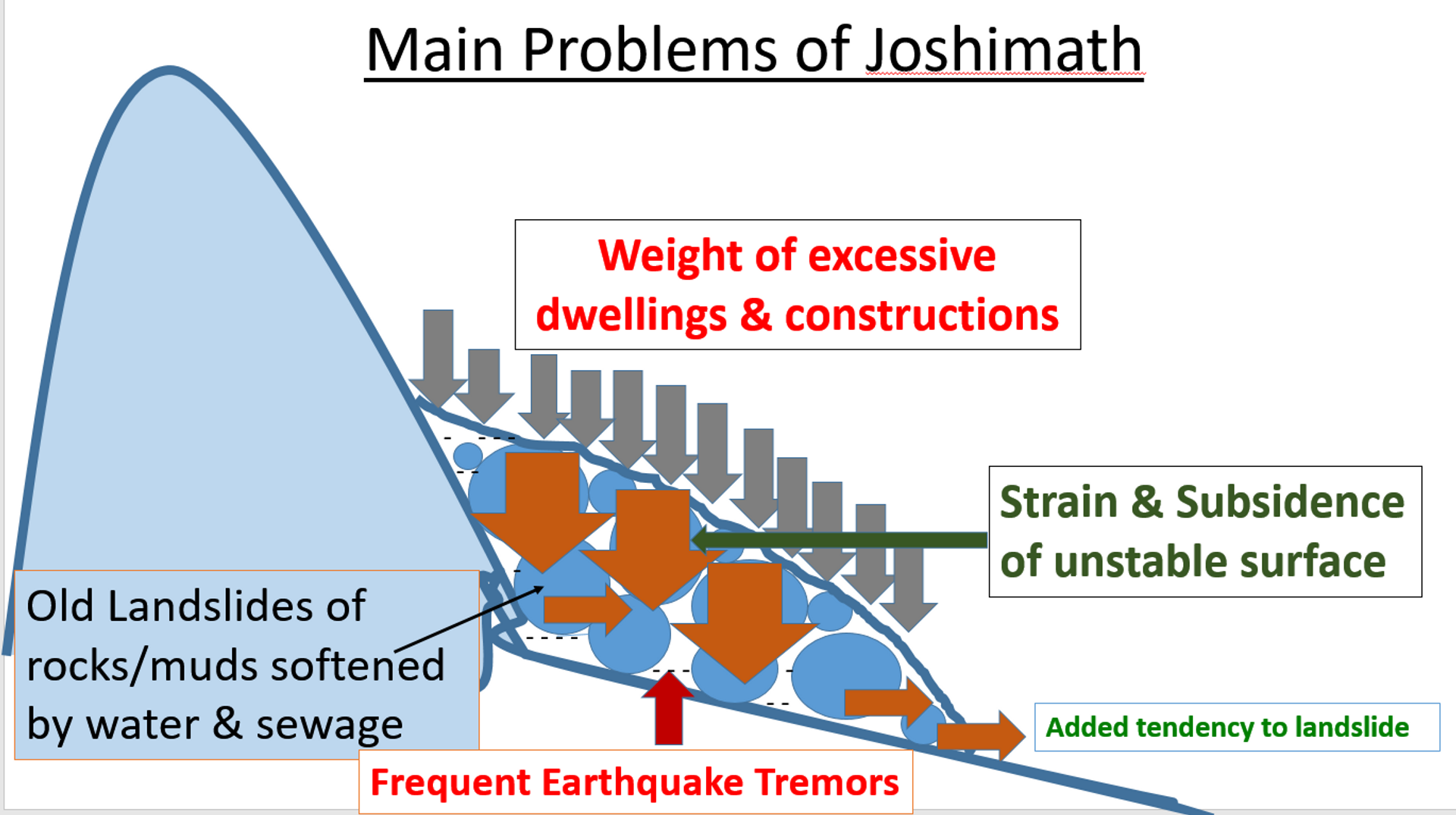 यह उल्लेखनीय है कि जोशीमठ प्राचीन भू-स्खलन के मलवे के ऊपर एक असंतुलित धरातल पर बसा है जिसकी वजन सम्भालनें की एक सीमित सीमा है।उस सीमा से ज्यादा भार होने पर उसके जमीन धँसनें का अंदेशा है। जोशीमठ के परिपेक्ष में वैज्ञानिकों का मानना है कि वहाँ इतने ज्यादा मकान बनाए गए हैं जो सुरक्षित सीमा से कई गुना अधिक है। साथ ही कुछ पहाड़ियों की तीब्र ढलान पर भी अस्थिर सतह बन गयी है जिस पर ज्यादा भार पड़ने से वहाँ भी भू-स्खलन की ज्यादा सम्भावनाएँ हैं।इन दोनों अन्देशाओं को इंडो - एशिया के ‘टेक्टोनिक चट्टानों’ के टकराने से हो रहे लगातार भूकंप से और अधिक अस्थिरता मिलती है।इन सभी मिले जुले संभावनाओं का यह परिणाम है कि जोशीमठ में आए भवन निर्माण विस्फोट के चलते वहाँ की जमीन धँस रही है और मकानों व आंगनों में दरारें पड़ती और बढ़ती जा रही है।यही बातें संलग्न चित्र में भी दिखाया गया है। ऐसा भी प्रतीत होता है कि कुछ मकान में दरारें नीचे हो रहे भू स्खलन के चलते भी हो रहा है I