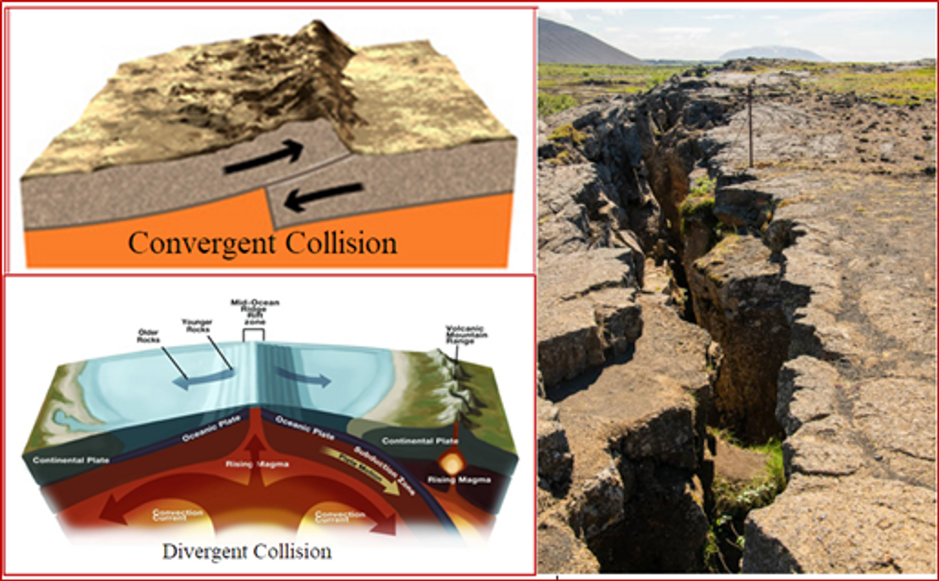 The subsoil effects of the earthquakes can be understood better as per the type of tectonic plate collisions whether it is of Convergence or Divergent types. Convergent types of collisions cause prominent tremors (often leading to surface cracks) and rise in the soil levels. On the other hand, Divergent type of collisions causes the tectonic plates to drift apart. If accompanied with volcanic effects, may cause a rise of the soil otherwise, will lead to caving with deep and wide fissures as shown below.