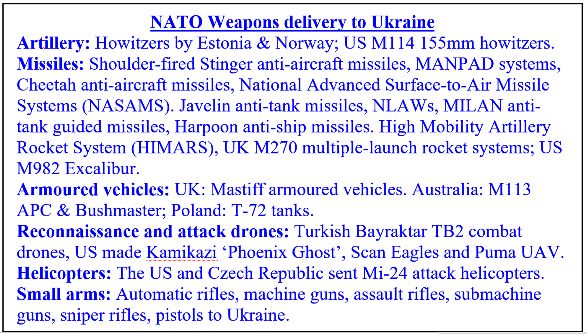 NATO and USA found a new market for their weapon sale in Ukraine. Apart from selling armoured eqpt in 2014, US sold sniper rifles in 2017 worth $41 million, anti-tank Javelin missile in 2018 with 39 launchers worth $47 million. A year later, they sold another 150 missiles with 10 launchers worth $39 million. Besides, there were several other non-lethal military equipment incl clothing and operational aids, supplying several fast boats. In 2021 US deliveries of armaments and military equipment to Kyiv reached $650 million. In the winters of 2021 while Russian military exercises were taking place on the Ukraine border, USA had raised an alarm of impending Russian invasion and was able to send many of the NATO weapons on a war footing, by its cargo planes. By now, US/NATO has supplied more than 1,400 antiaircraft Stinger missiles, 8,500 Javelin anti-armor missiles (critical in destroying Russian tanks), 700 Switchblade drones and 142 pieces of howitzer artilleries. In a nutshell, the text box enumerates some of the advanced NATO/WU weapons that found a market in Ukraine, some as aids (having strings though) and others purchased. Very recently, US has provided a new USD 2.98 billion package of military aid for Ukraine, which include several High Mobility Artillery Rocket System (HIMARS) and six additional National Advanced Surface-to-Air Missile Systems (NASAMS). Biden Administration alone has approved >$11.8 billion in assistance to Ukraine.