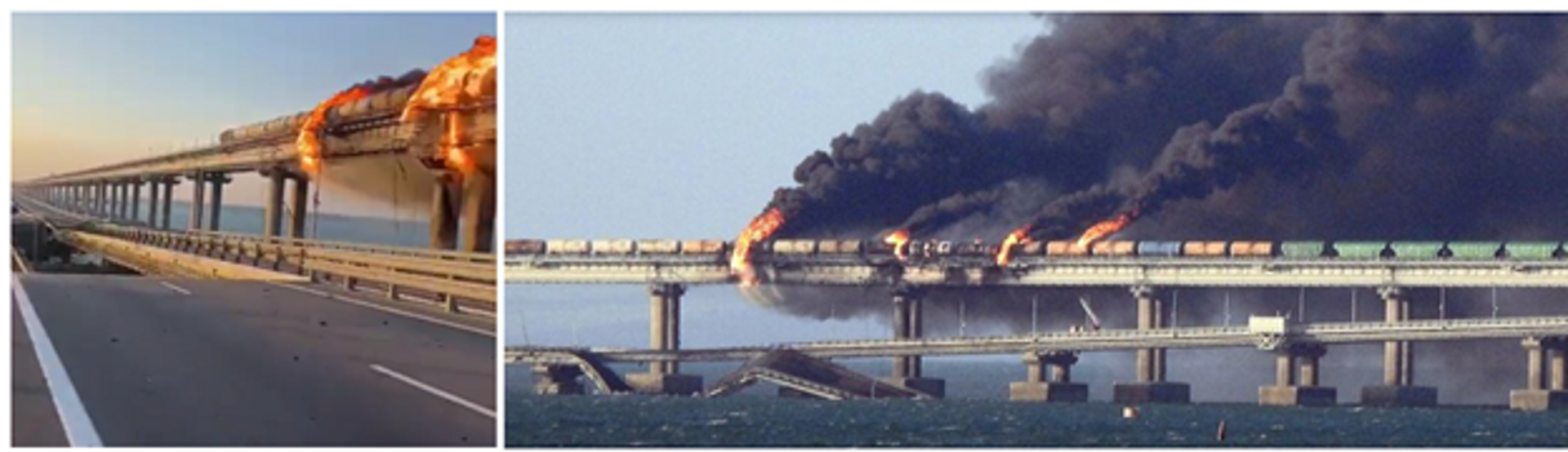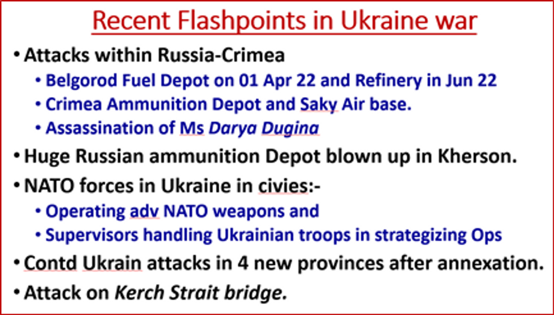 Several major Russian Military reversals in Kherson and Donbas bear testimony to it. They have been undertaking some specific interdiction in the recent weeks. However, a gradual flash point seems to be reaching after Ukrainian agent killed Ms Darya Dugina, Ammo Depo of Kherson, Drone attack on Russian Fuel Refinery inside Belgorod, attacked Saky Russian airfield inside Crimea, and now attacked Kerch Strait bridge the only bridge linking Crimea to Russia. It may not stop here, clearly NATO is working on a bigger plan of harming and decimating Russia, that is fraught with a devastating consequences for Ukraine…that may not remain limited to Kiev. Actually, this war is no longer in Zelensky’s hands. His masters in EU and USA are the actual planning power houses fighting Russia. This will continue as long as they want…and they will continue their conspiracies in Ukraine till this nation is crippled, both in terms of men and might.
