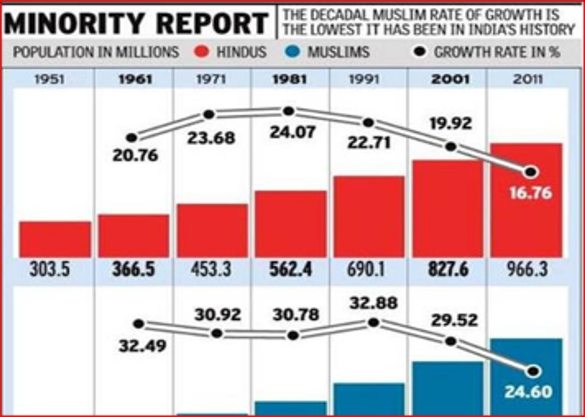 Covid19 prevented timely census in 2021. However, applying the decadal growth rate thru’ regression equation and adding up the illegal Bangladeshi & Rohingya Muslims acquiring fake citizenship (if the officials are able to record it properly), percentage population will show a jump in the coming census…of approx. 77% for Hindus and nearly 17% for the Muslims. This will surely become a major talking point for the Hindus as to how to prevent fall in Hindu religious demography in India. India being the only nation where Hindus originated and live as native, govt will surely have to enact law to safeguard them from being extinct. If not, it will surely be levelled as the worst collective failure of Modi Govt.