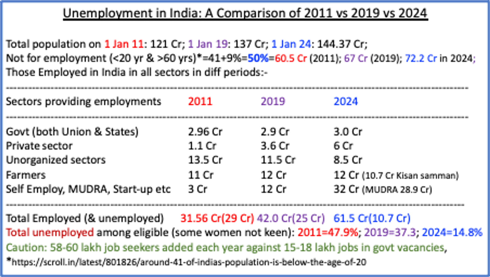 Inadequate Jobs in Govt Sector. The number of jobs in various Govt Services, both at the Centre and States, have remained static for nearly 4 decades or so. On the other hand, the spurt in population for the reasons mentioned above, have further doomed the prospects of employments. Thanks to the private and un-organised sectors that did provide relief. Modi govt has also created better prospects for the self-employent thru’ various schemes, be it MUDRA loans, Start-up India, Stand-up India as well as some others. The text box below shows how the self-employment schemes brought motion to the Indian economy.