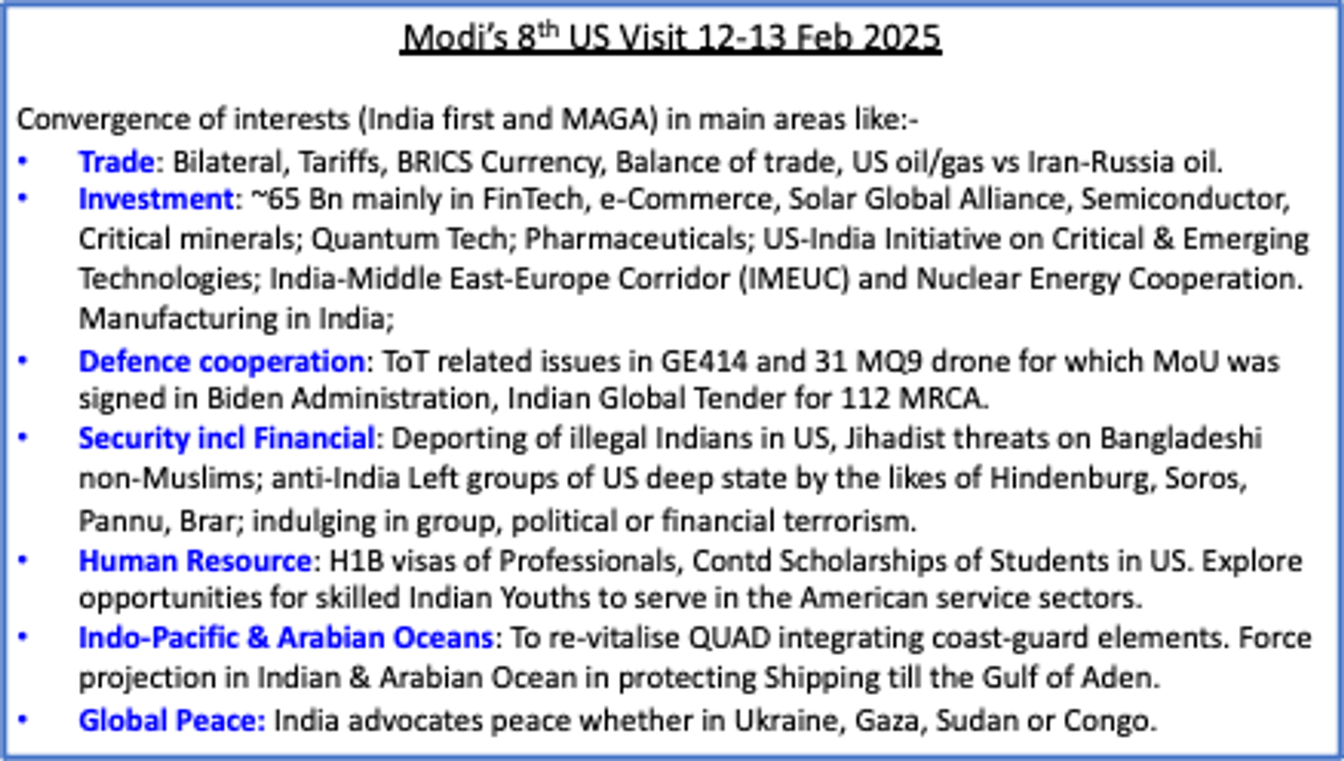 PM Modi has just completed his 8th visit to the US and his first to trump2 administration. Whatever be the reason for visiting Washington in the early days of the new administration in office, the outcome of the visit is surely positive but not the best that was expected out of a friendly head of the US State. India will have to carefully craft its trade policies against reciprocal tariff that might ease out a bit after the dusts settle down. There are surely many positive takeaways in the investment, regional security and Indian role in the Indo-Arabian Oceans. Although USA has offered its latest 5th gen aircraft F-35, India will have to decide if it really wants it. However, on the ToT issues of GE 414 Engine, some ice seems to have melted and HAL team will be visiting US in March this year to negotiate its extent and other nitty-gritties. Overall, it was a positive development but not the best that was expected.