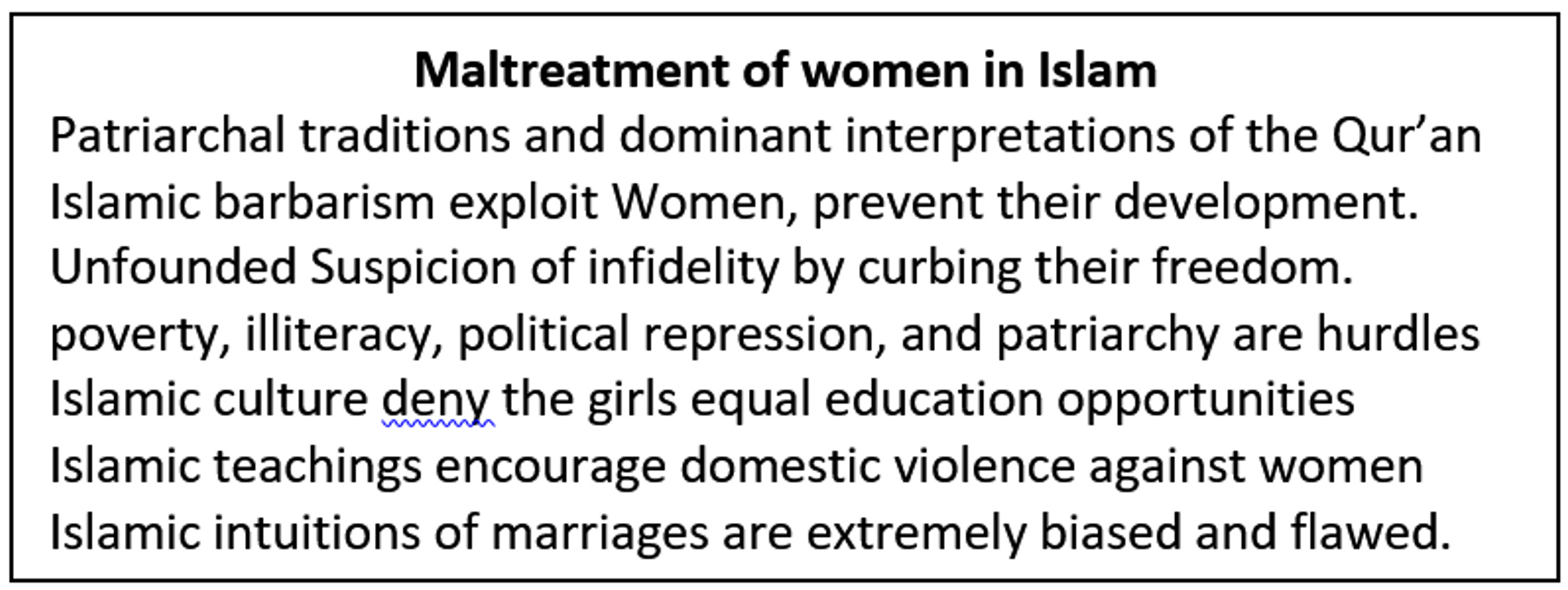 There is no stereotype of a human…men or women. However, within a given geopolitical and socio-cultural parameter, some of the commoner behaviour do render a semblance of predictability. One’s faith and religion also tend to make a distinct identity but there are no stereotypes. Aryans, the followers of Vedic ideologies are largely peace-lovers with the branching out Jains and Buddhists being exemplary…BUT…don’t take them for granted, we will analyse it later as to why. Jews and Christians too were tolerant groups. Jesus being example of tolerating the extreme; but again, don’t take them too for granted. Islam is the only faith that is intolerant by nature. This faith was formed by a commoner, named Mohamed, who later self-proclaimed to have been blessed by an angel, who was highly fateful, intolerant and fascist to the contemporary Arabian tribes [1,2] . The author again cautions for not making stereotypes for obvious reasons…that Islam too has aberrations and exceptions. Any faiths / religions having lesser deviations from predicted behaviours could be termed peace-loving, tolerant or intolerant depending upon its dominant features. the same is the case for Muslim women.