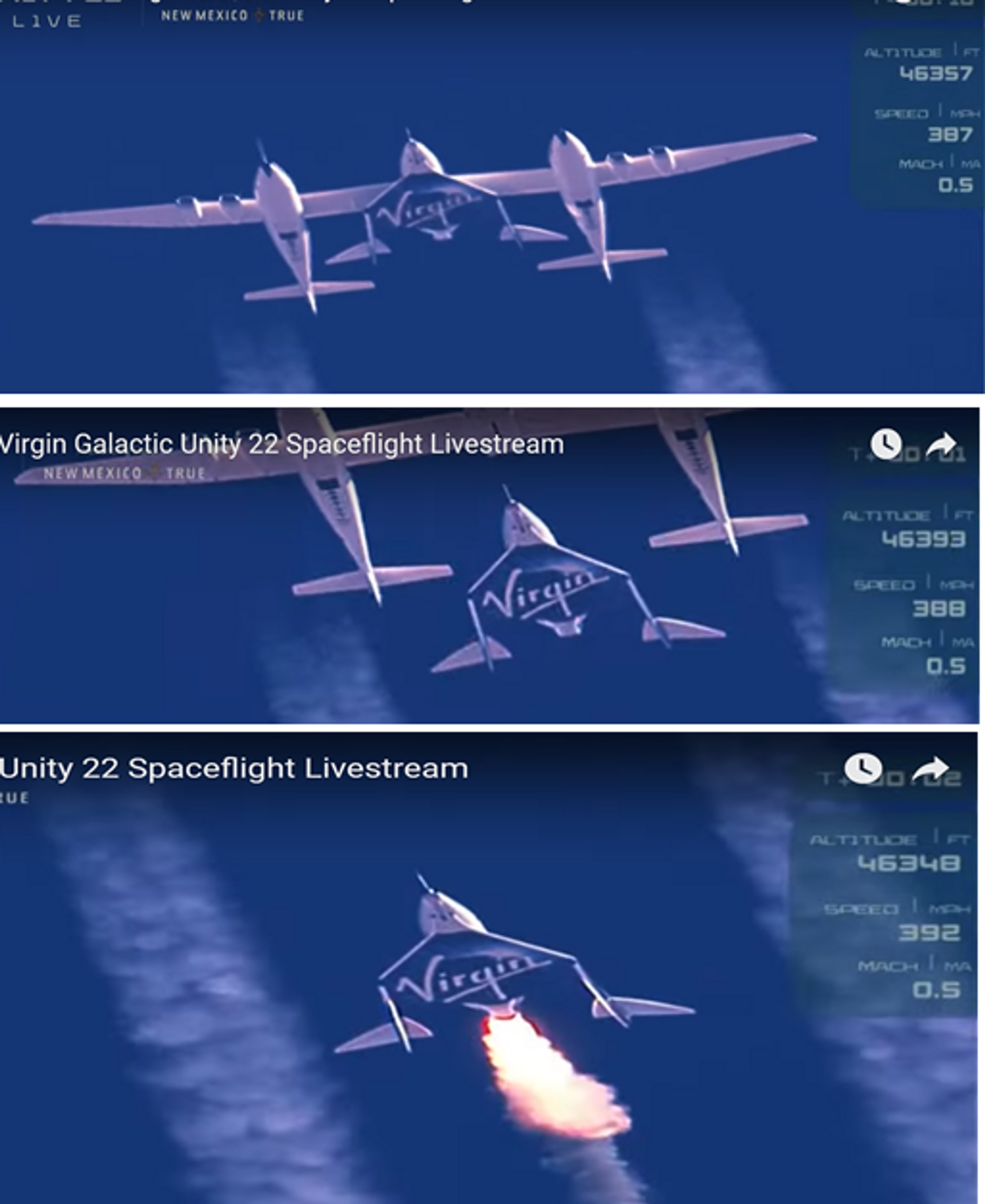Their rocket-propelled spacecraft VSS Unity was released from under the wings of aircraft VMS Eva at 46393 ft AMSL with forward speed of 389 Mi/hr, with slight nose-up attitude to facilitate smooth separation at the designated location.
