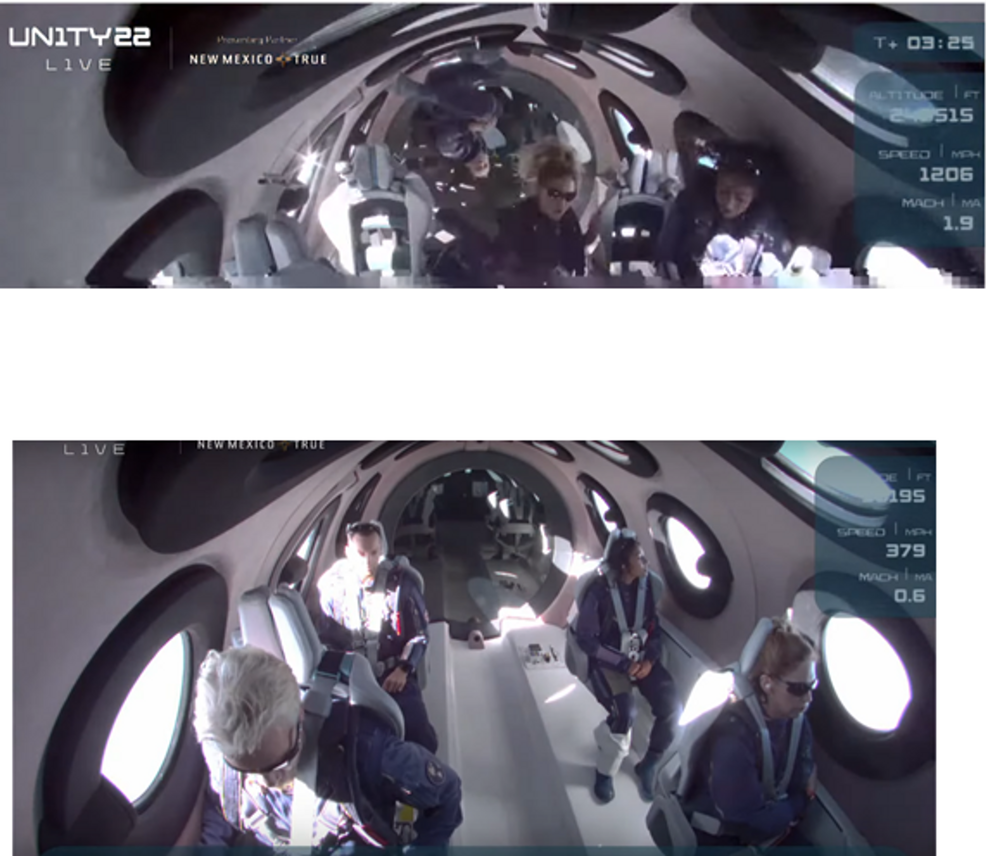 As mentioned above, there seemed to be obstructions and hurdles in their free-floating due to the erect seats as well as the lower craft ceiling heights. It also seemed to be an unstable craft during the weightlessness as free-floating passengers seemed to be a little shaky & jerky under a very poor and fractured video. Could the passengers view the curvature of the earth from the ceiling altitude of the flight? We don’t know. The sunlight from the windows seemed very intense…capable of causing sunburn of the exposed skin. UV could have been filtered out by the window Perspex sheets but the IR component? We don’t know.