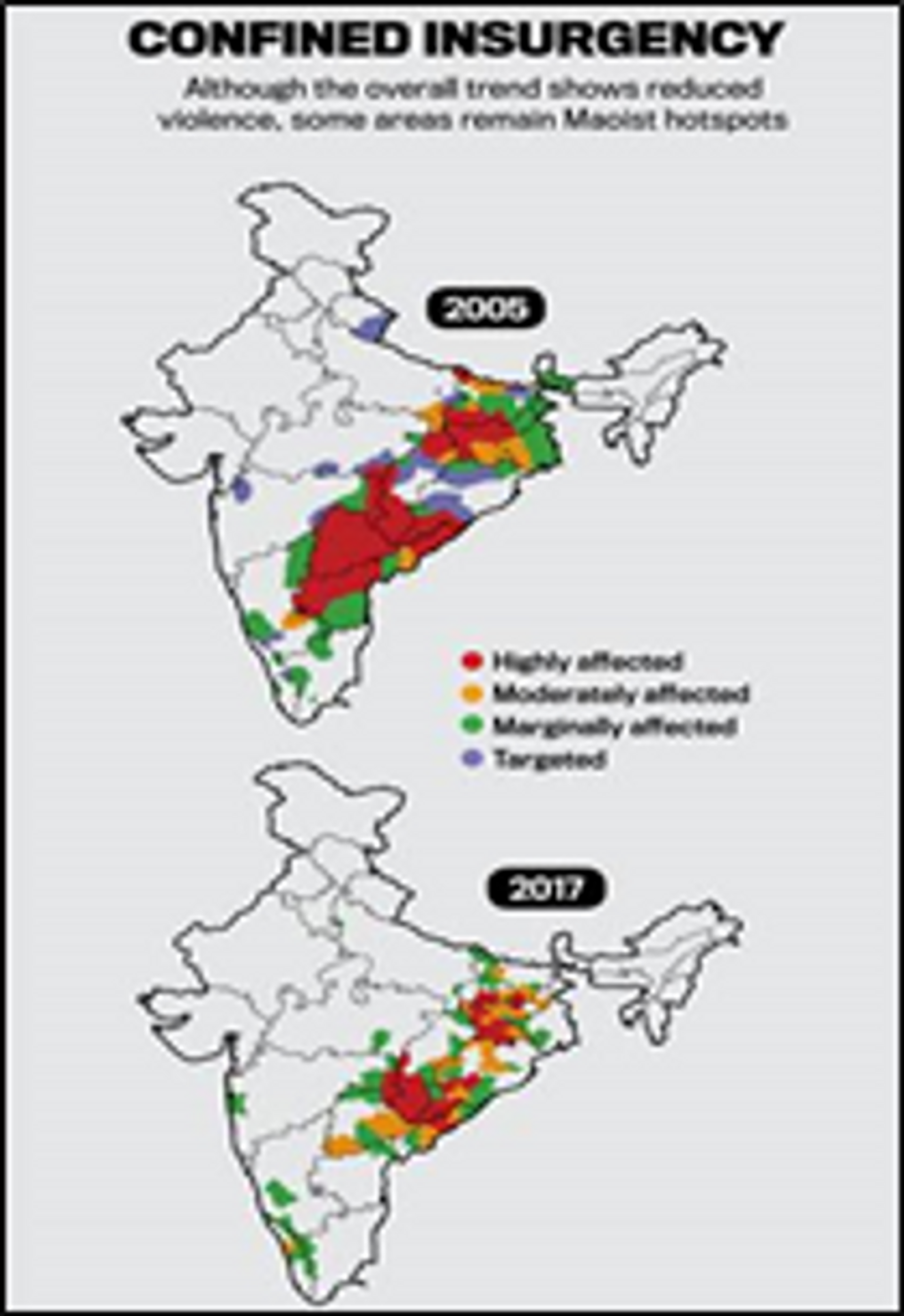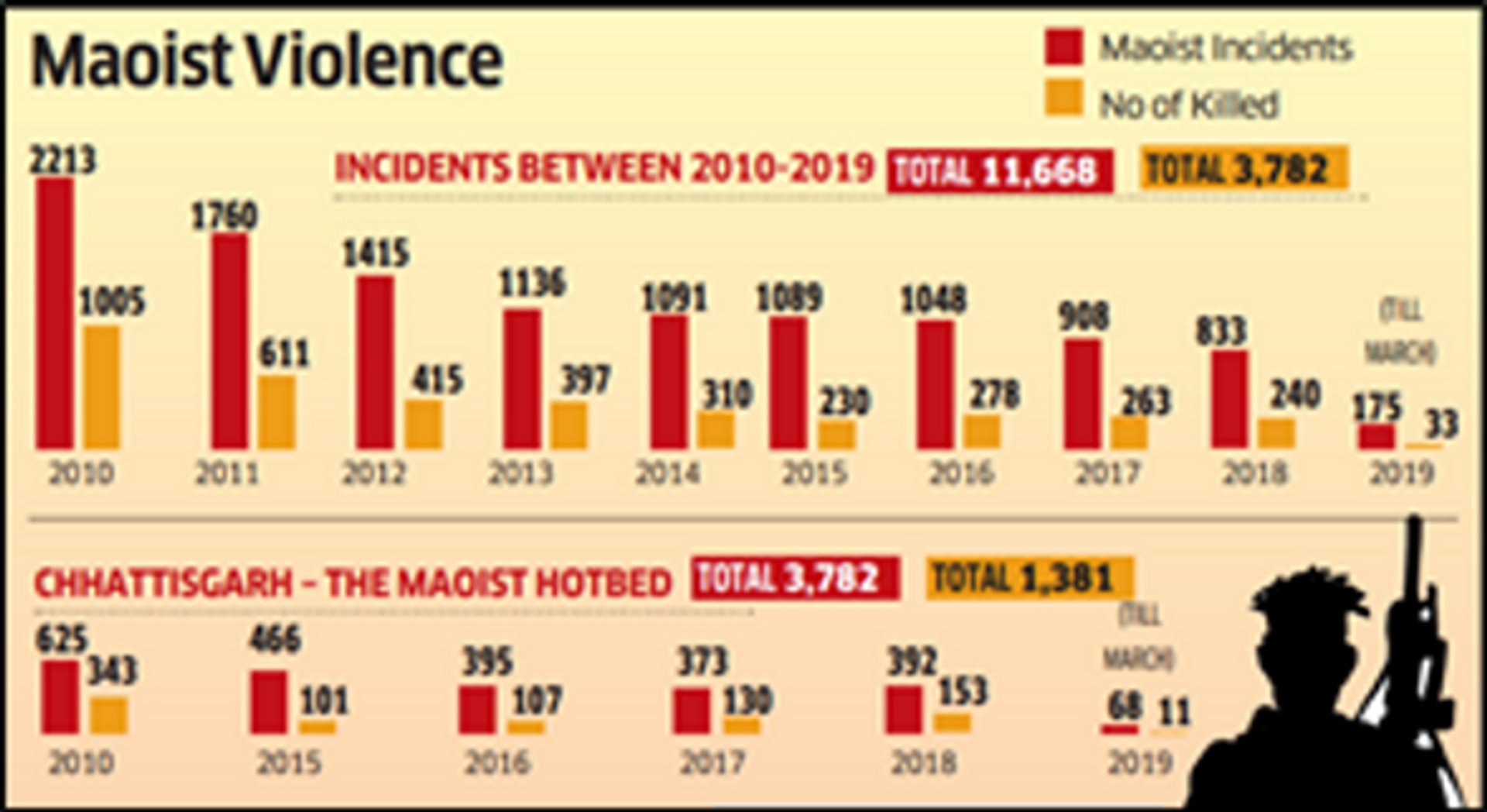 Union govt statistics showed that 3,782 people were killed in 11,668 incidents of Maoist-led Left Wing Extremist (LWE) violence between January 2010 and March 2019 with Chhattisgarh topping the list. The govt reports claimed that in those period, there have been a significant reduction (26.7%) in the LWE violence incidences and 39.5% reduction in deaths. Of the dead and injured, the security forces have borne the brunt the most. This is highly unacceptable on any account. Naxalite violence has shrunk from 330 police stations of 76 districts of over 10 states in 2013, to 251 police stations in 60 districts spread across eight states in 2018 with just 30 districts accounting 89%. But why should such violence be permitted even in those 30 districts? It is surprising why Chhattisgarh state govt and the Home Minister of India have not launched a major counter-offensive against the recent Dantewada/Sukma Maoist attacks.