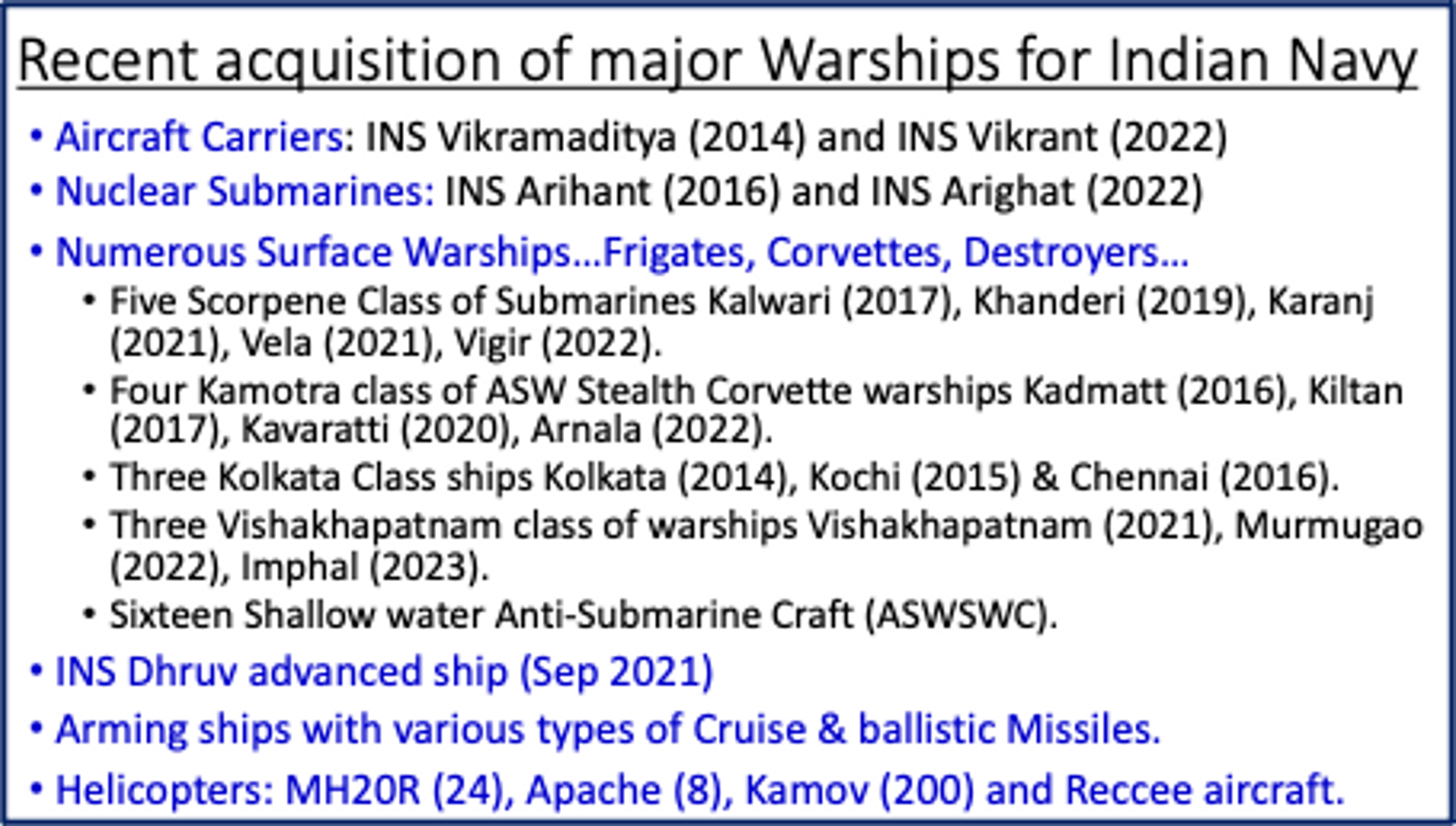 India has multiple security challenges. While it has enemies and adversaries on northern and western borders, three sides of coastal areas leading into Arabian and Indian Oceans incl Bay of Bengal are the most challenging. The challenges could arise anywhere from Gulf of Aden to the Malacca Strait. Further, with the QUAD cooperation firming up, Indian navy may have to prepare itself to take up missions in the South China Sea as well. Presently the outreach is limited in both Eastern and Western Oceans with China and Pakistan already trying to extend their joint cooperation. India in coming years must bring up newer naval bases in the smaller islands on its western side as well as in the Greater Nicobar island to bring Malacca Strait under its offensive ranges. This reach may have to be extended up to Thailand’s Kra-Isthemus through which the Chinese may sneak-in for any misadventure. Untrustworthiness of the Chinese are well known. This needs augmentation of both quality & quantity of the Indian Naval Assets. Naval power expansion by China will mandate India to dominate surrounding seas, be it Bay of Bengal, the Indian Ocean or the Arabian sea. We wish the Indian navy the very best of all.