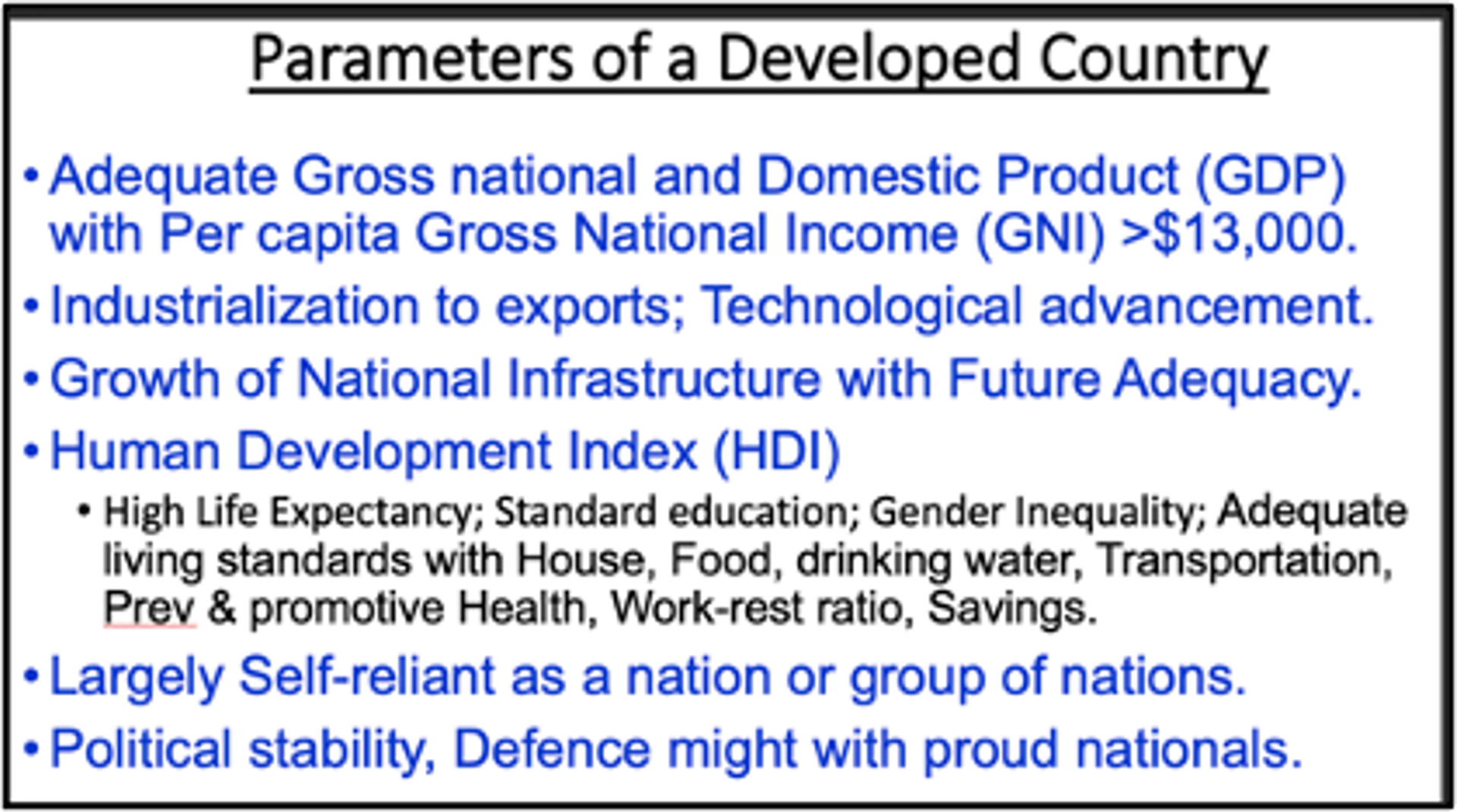 PM Narendra Modi has made a strong pitch for “Viksit Bharat” by 2047 from the ramparts of Red Fort on his 11thIndependence Day address to the nation on 15 Oct 2024. He called for the participation of all 140 Cr citizen. He re-emphasized of making it possible while trying to become the 3rd largest economy in the world in the next few years. There is an assumption among many that economically grown nation could be equivalent to a developed nation which is not the case. A developed nation is much more than economic growth alone.