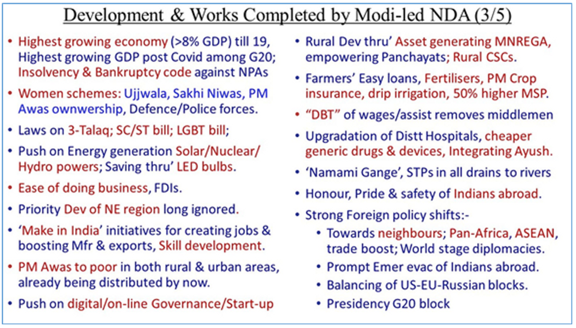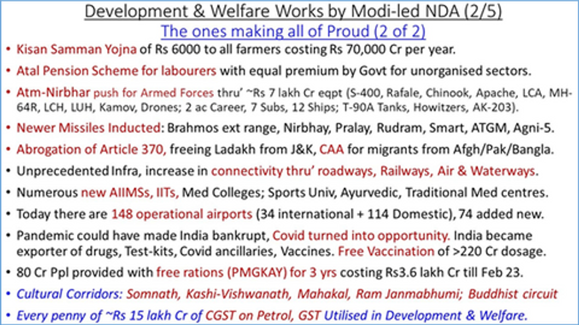 - Running world’s largest welfare programs of PM Gareeb Anna Yojna, Ayushman Bharat Yojna, Kisan Samman Nidhi, PM Awas Yojna, Toilets, Har Ghar Nal se Jal, 3000 million dosage of Covid Vaccination besides several others.