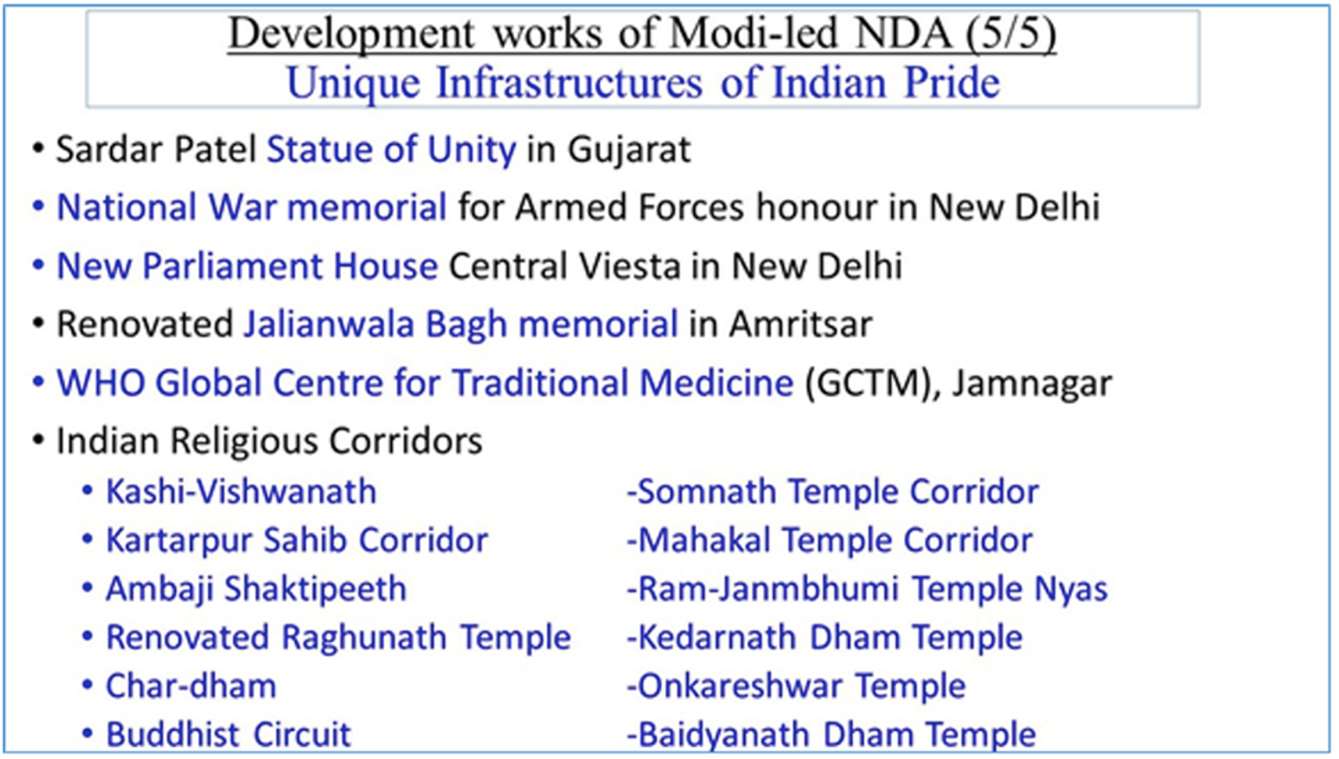 - Cultural revivals of long-neglected Indian Religions thru’ various Corridors of Somnath dham, Kashi-Vishwanath dham, Kedarnath dham, Ujjain-Mahakal dham, Ayodhya-Ram Janmbhumi, Buddhist circuit, Kartarpur Sahib etc etc.