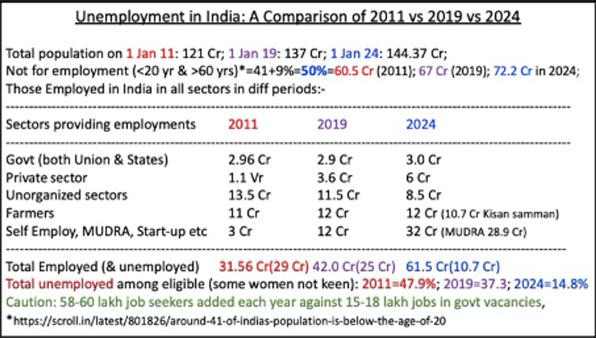 Unemployment in the country has eased out considerably with the self-employment schemes. The statistics of the unemployment in 2024 vis-à-vis 2011 in the text box clearly shows decline from 48.2% among the eligible population in 2011 to 25.7% by now, nearly half. Surely political opponents are crying ‘unemployment’ and high inflation to hide their own failures (read ‘विपक्षी राज्य सरकारें निकम्मी हैं; मोदी सबको रोजगारदे’, https://thecounterviews.in/articles/incompetent-opposition-ruled-state-govt-modi-to-give-employment/).