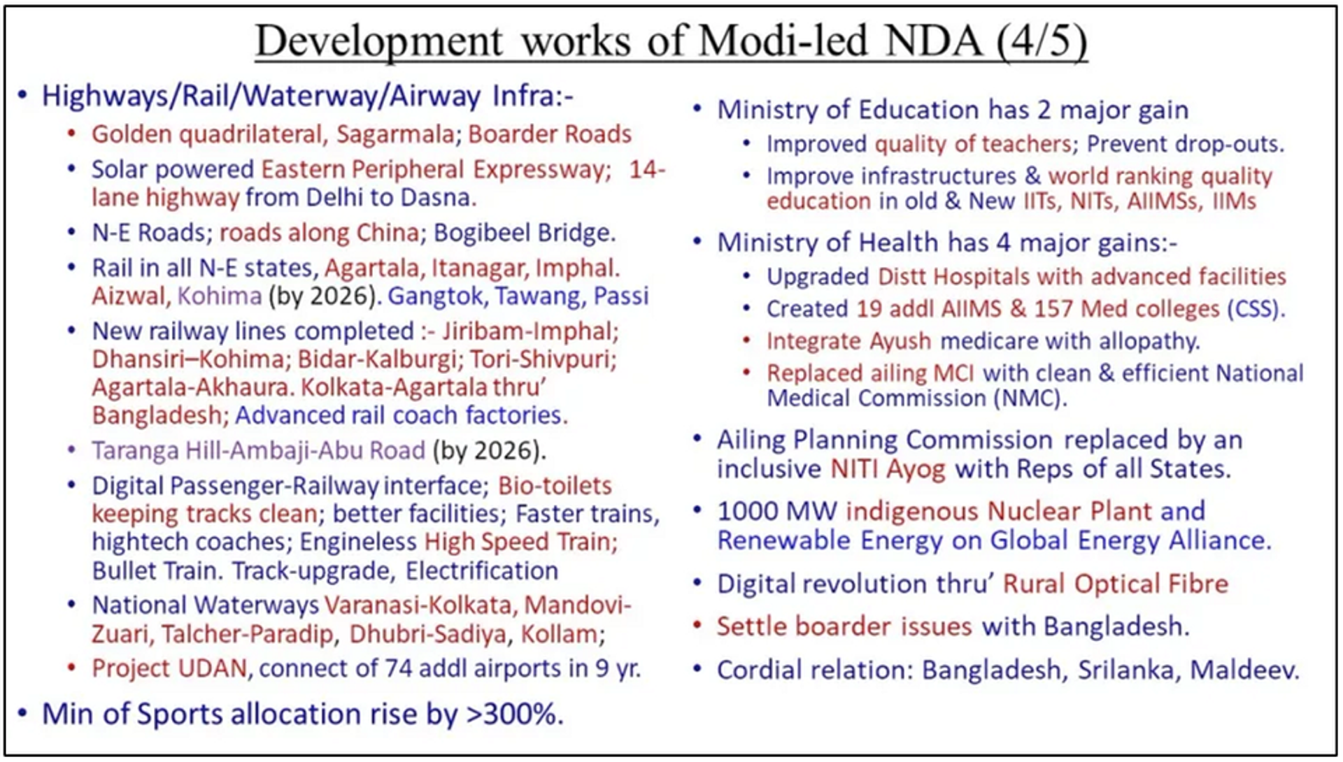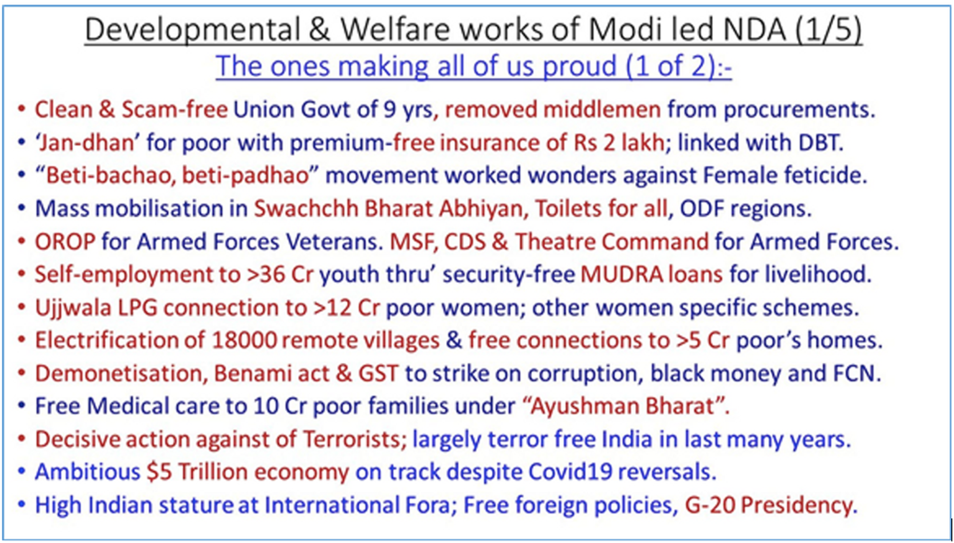 The above are only some of the high end citizen and nation oriented programs of Modi govt initiated and implemented. Accordingly, there are several tens of such programs doing well for the betterment of our nation and nationals. For the sake of political narrative, Modi govt actions of abrogating Art 370, erecting a highly significant Ram Mandir in Ayodhya, reforming Muslim Personal Law of 3-Talaq etc are only some of his numerous achievements.