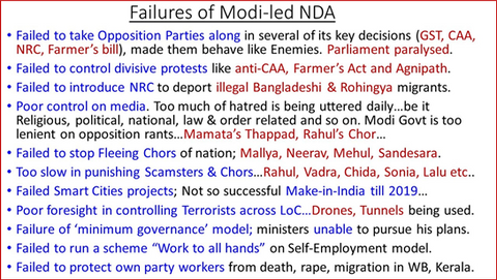 Today all pseudo-secularists in the nation take pride in tainting Modi govt as Right-wing Hindu party although his welfares are for all nationals, minorities benefitting the most. Today most Hindus look at Modi Govt to Muslim’s deliberate attempt of altering the religious demography of India. India is the sole major economy without an NRC listing, with about 50-60 million illegal Bangladeshi/Rohingya population living illegally, eating away Indian’s right. They are threats both to our economy and security. Waqf Board of India has looted maximum public and private properties but Modi govt has not yet initiated legislations to liberate it (read "Waqf Acts of 'Loot-India', https://thecounterviews.in/articles/waqf-acts-of-loot-india/). Similarly, there are many pending actions of decades where parliament is required to enact laws (read "Urgent Issues Being Ignored in Our Parliament:, https://thecounterviews.in/articles/urgent-issues-being-ignored-parliament/). Some other failures of Modi govt are enumerated in the text box below:-